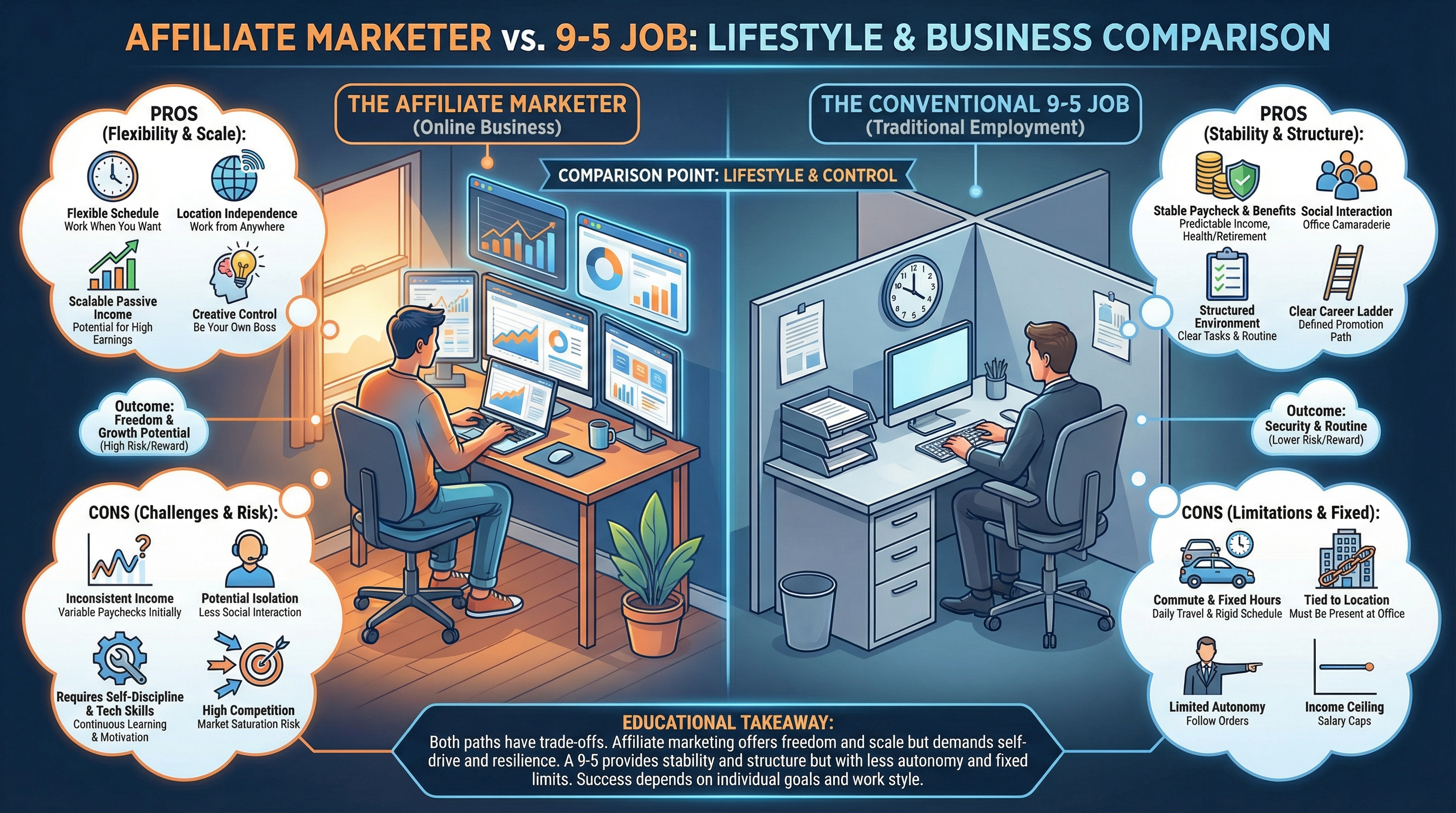 - The real difference is control: employment trades upside for stability; affiliate marketing trades stability for ownership.